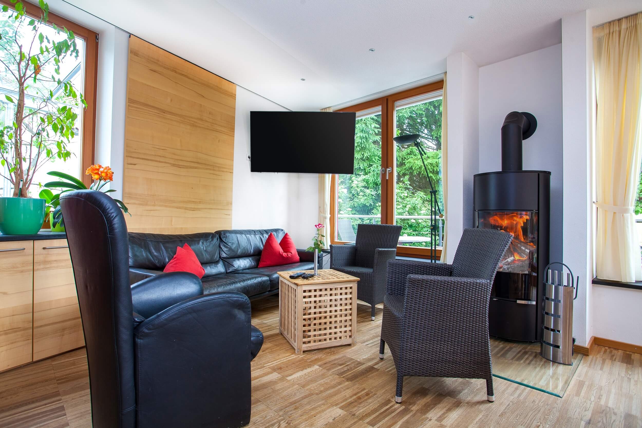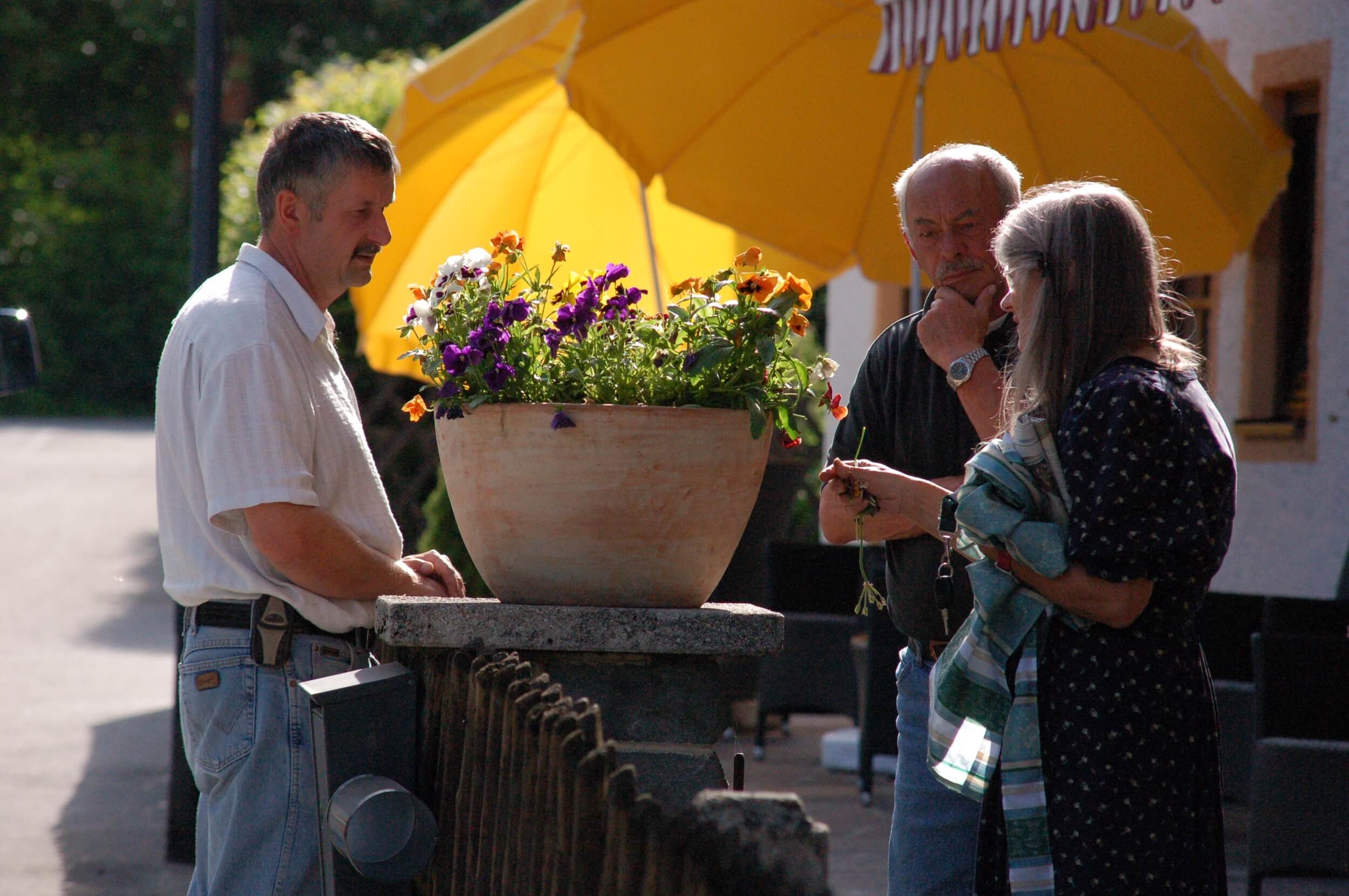 Schon der Weg zum Haus führt durch den schönen Garten mit Blumenbeeten, Apfelbäumen und hohen Tannen, mit Kinderspielplatz und Gartenhäuschen, mit Grillplatz und Ruhewiese. Dann gelangt man auf die Ostterrasse, vorgelagert dem wintergartenähnlichen neuen Speisesaal. Hier kann man in der Sonne frühstücken, entspannen oder einfach nur mit Blick auf die Berge träumen. Dazu braucht es freilich Ruhe, und die gibt es bei uns wirklich. Da stört kein Verkehr, das Lauteste ist manchmal das Gezwitscher der Vögel.